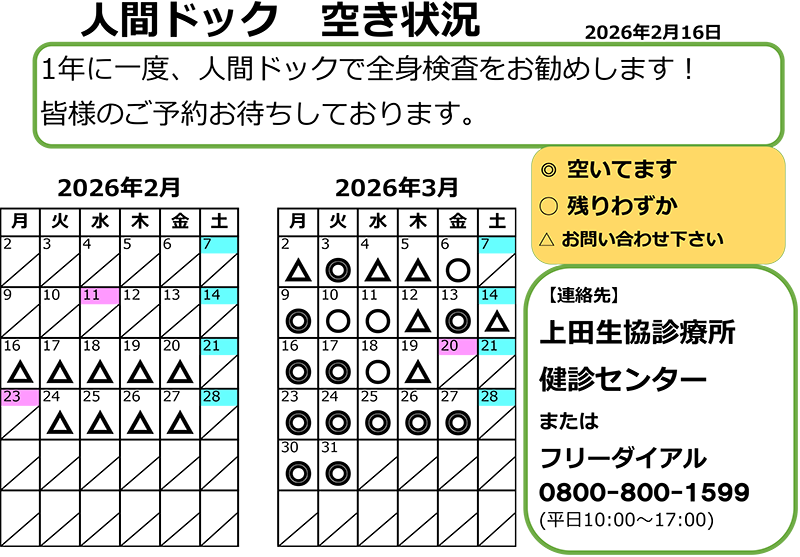 2026年2月16日 / 最終更新日 : 2026年2月16日 toshiniryou お知らせ 2026年2月・3月の人間ドック空き情報を掲載致しました 2026年2月・3月人間ドック空き情報を掲載致します。 キャンセルが生じる場合もありますが、お早目のご予約をお願い致します。